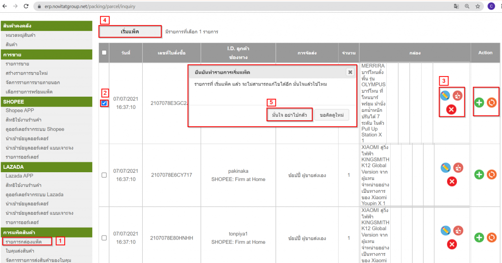 32. เข้าเมนูรายการกล่องแพ็ค 33. เลือกรายการที่จะแพ็ค