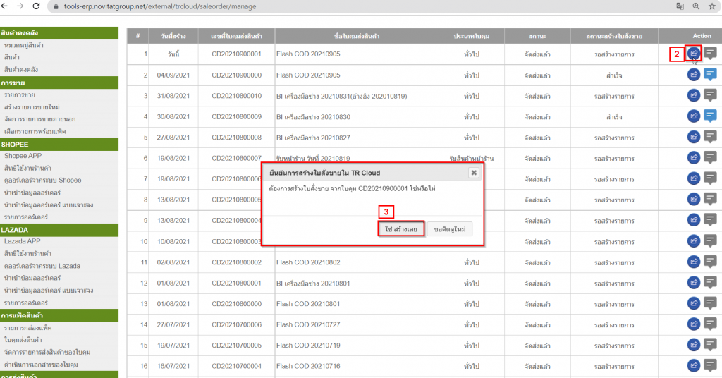 3. กดปุ่ม ใช่สร้างเลย (เมื่อกดแล้วปุ่มแล้ว ตรงช่องสถานะสร้างใบสั่งขาย จะเปลี่ยนจากรอสร้างรายการ เป็น สำเร็จ)