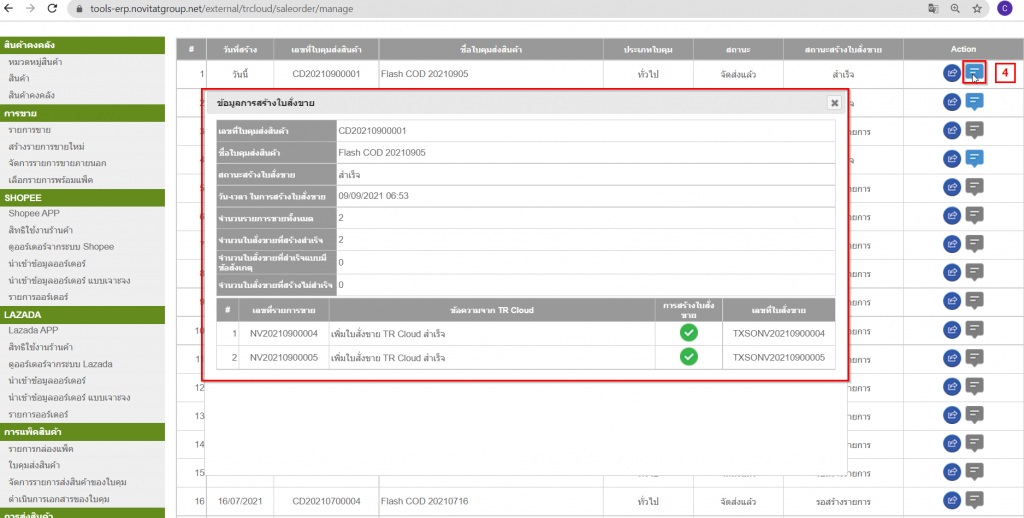4. กด ไอคอนสีฟ้า เพื่อดูรายการที่ทำสำเร็จและไม่สำเร็จ และดูเลขที่ใบสั่งขาย