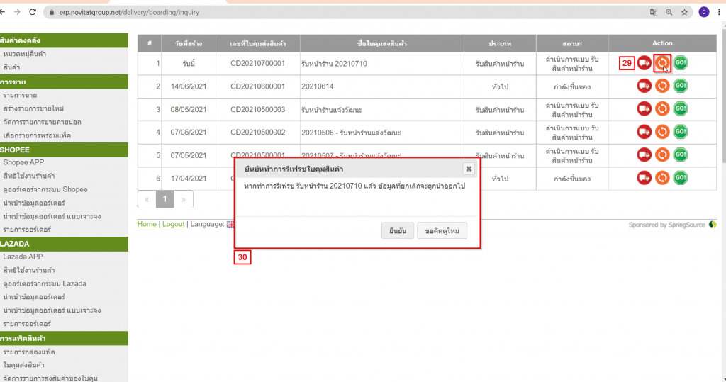 30. หากกดยืนยัน จะทำการ ลบ(รีเฟรช) รายการที่ยกเลิกนำขึ้นรถ