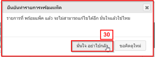 31. จะปรากฎหน้าต่าง ผลการทำรายการพร้อมแพ็ค กด ปุ่มรับทราบ